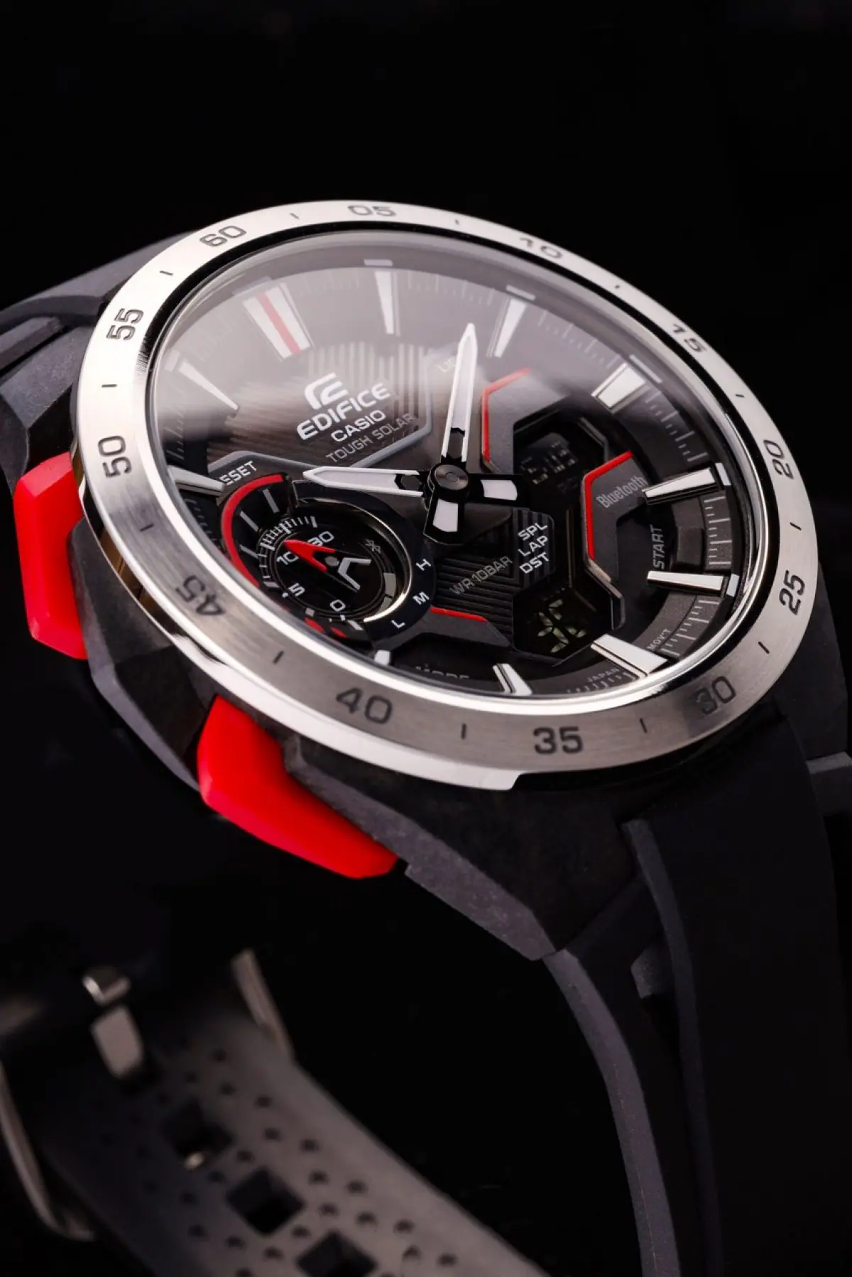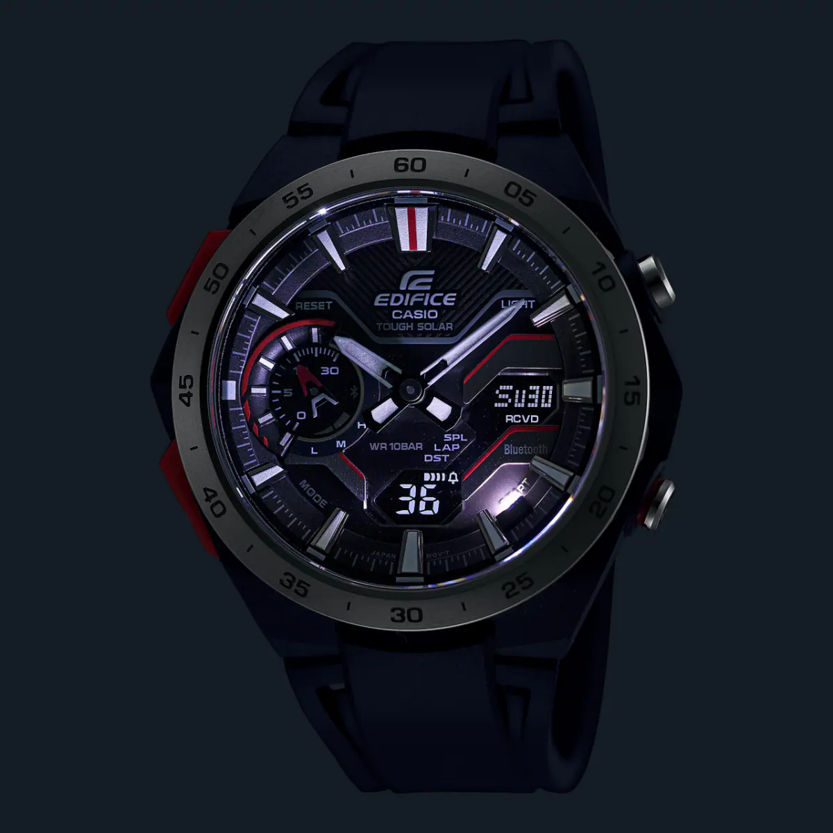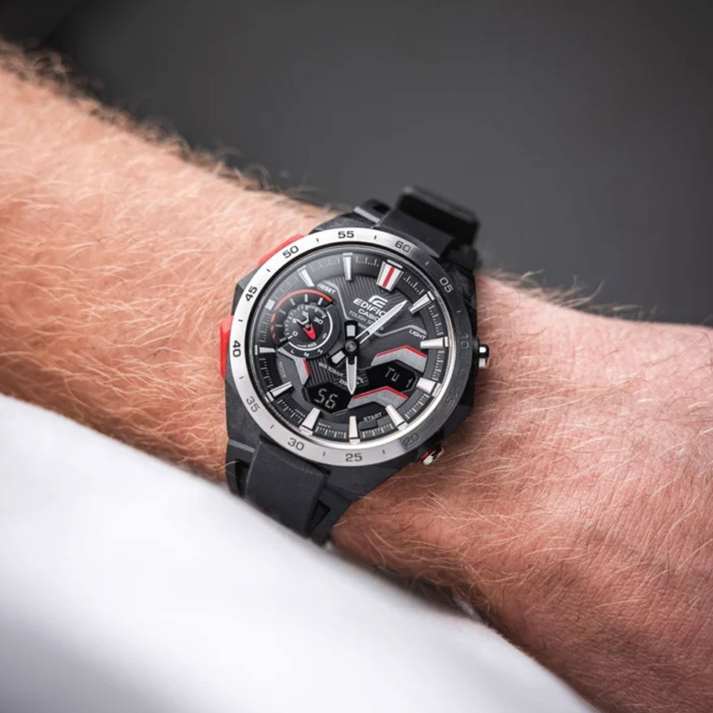 با EDIFICE WINDFLOW ECB-2200P، کرونوگراف ترکیبی دیجیتال-آنالوگ الهامگرفته از پیست مسابقه، میتوان حس شتاب خالص یک خودروی فرمول یک را هنگام درخشش در پیست تجربه کرد. طراحی نمای جانبی که حس عبور باد روی یک خودروی فرمول یک با گلگیرهای قوسدار را تداعی میکند، همراه با صفحه مکانیکی تیز و چندبعدی، جلوهای خاص از سرعت ناب را نمایش میدهد. قاب رزینی تقویتشده با فیبر کربن، استحکام ساعت را افزایش میدهد و در عین حال وزن آن را سبک نگه میدارد تا برای استفاده روزمره مناسب باشد.