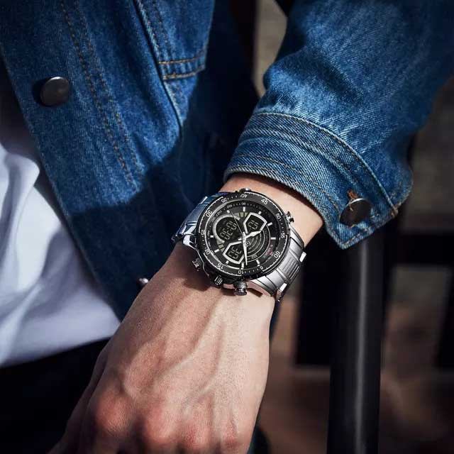 قابلیت نمایش 24 ساعته , قابلیت نمایش ساعت دوم , تاریخ شمار , صفحه طرحدار , نور پس زمینه , تایمر , عقربههای شبتاب , آلارم , شیشه ضدخش