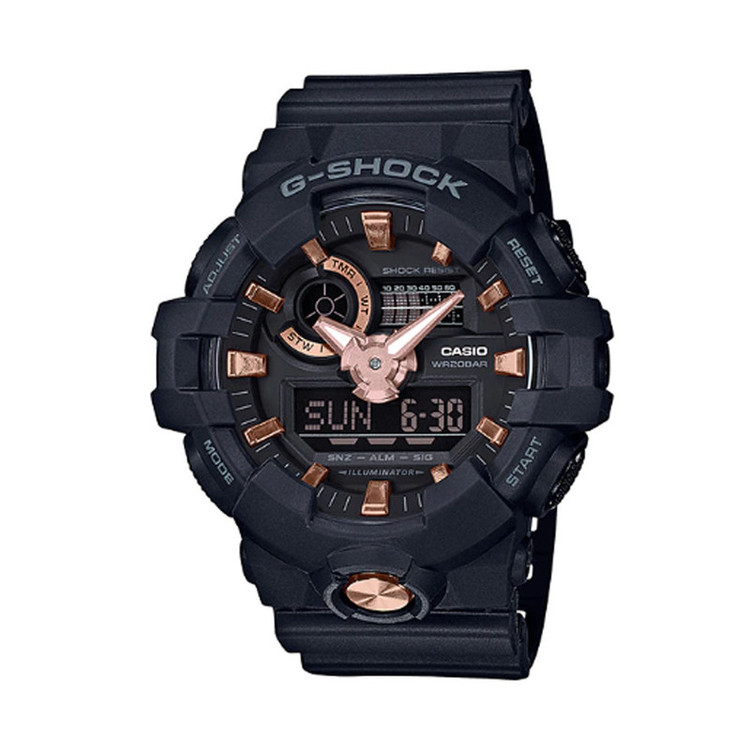 از G-SHOCK، برندی از ساعت که همواره راههای جدیدی برای آمیختن نمادهای فرهنگی جهان با طرحهای مبتکرانه و هیجانانگیز پیدا میکند، مجموعهای از مدلهای جدید مد خیابانی با تزئینات طلایی و طلایی صورتی ارائه شده است. مدل پایه، مدل نمادین دارای دکمه جلوی GA-710 است. استیل ضد خش درخشنده دکمههای جلوی این مدلها ظاهری متمایز و شبیه تجهیزات ایجاد میکند. رنگآمیزی ساده مشکی مات آن با تزئینات طلایی سگکها، نشانگرهای ساعت، عقربههای ساعتشمار و دقیقهشمار، صفحههای مدرج و حروف قاب تعادلی ایجاد میکند تا به شکوه و ابهت متمایز آن بیفزاید. کرونومتر با آلارم زمان هدف ویژگی حرکت موقتی عقربهها Super Illuminator هستند