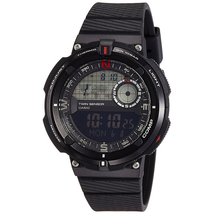 ساعت مچی مردانهی مدل «SGW-600H-1BDR» برند ژاپنی «کاسیو» (Casio) از نوع دیجیتالی است که به صورت روزمره و ورزشی قابلیت استفاده دارد. تکنولوژی ساخت ساعت کاسیو الکترونیکی است و کارکرد آن از طریق منبع انرژی باتری است. ساعت مردانهی کاسیو دارای ابعاد بدنهی 50.6×45 میلیمتر، ضخامت بدنه 12.8 میلیمتر و عرض قاب 45 میلیمتر است؛ همچنین کاسیو دارای وزنی معادل 46 گرم است. بدنه، شیشه و بند کاسیو از جنس رزین و به رنگ مشکی ساخته شده است. قاب یا اصطلاحاً قسمت بزل ساعت آلومینیومی است. صفحهی ساعت مدل SGW-600H-1BDR کاملاً گرد است. بند ساعت با قفلی از نوع سگکی و ساده باز و بسته میشود و قفل هم از همان جنس رزین ساخته شده است. کاسیو مردانه مدل SGW-600H-1BDR تا عمق 100 متر در برابر فشار آب مقاومت دارد. کاسیو قادر است زمان 48 شهر دنیا را نمایش دهد و دارای آلارم برای اعلان هر راس ساعت است. کاسیو دارای نور پس زمینه از نوع «Electro-luminescent» است تا بتوان صفحهی تیرهی آن را بهراحتی مشاهده کرد. کاسیو تاریخشمار دارد که هم شماره روز ماه و هم نام روز هفته را در پایین صفحه نمایش میدهد. کاسیو دارای قابلیت نمایش 24 ساعتهی زمان است. همچنین از دیگر ویژگیهای ساعت زیبای کاسیو میتوان به دارابودن دماسنج، کرونومتر و ساعت دوم اشاره کرد؛ همچنین کاسیو دارای قطبنمای دیجیتالی است که نماد هر قطب با حرف اول آن بر روی بزل و به رنگ قرمز و سفید مشخص شده است.