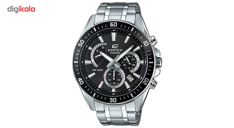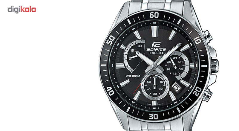 ساعت مچی عقربهای «کاسیو» مدل «Casio EFR-552D-1AVUDF» از ساعتهای شیک و جذاب مردانه از این برند ژاپنی است که در گروه ساعتهای «ادیفایس» (Edifice) دستهبندی میشود. این ساعت بندفلزی و کلاسیکاسپرت در طراحی خود از رنگ دوم مشکی بهره میبرد که در کنار بند و بدنهی نقرهای زیبایی قابلتوجهی را به همراه دارد. بر روی صفحهی مشکی این ساعت کرنوگراف، شاهد قابلیتهایی هستیم که مهمترین آنها همان زمانسنج و تاریخشمار است. تاریخشمار که شاید کارآمدترین قابلیت ساعتهای کلاسیک به نظر برسد، در این مدل بین نشانگر ساعت چهار و پنج تعبیه شده و شمارهی روز ماه را روی پسزمینهای سفید نمایش میدهد. علاوه بر دو شمارشگر مربوط به کرنوگراف یا زمانسنج که یکی از آنها به صورت نیمگرد (retrograde) طراحی شده، یک شمارشگر مربوط به نمایش 24 ساعته هم در سمت راست تعبیه شده که میتوان از آن برای تنظیم آسانتر تاریخشمار هم استفاده کرد. ساعت کاسیو مدل «EFR-552D-1AVUDF» با عرض تقریبی 47 میلیمتر در گروه ساعتهای صفحهبزرگ دستهبندی شده و طرح پرانتزی بالا و پایین قاب موجب میشود، ساعت روی مچ دست جلوهی جذابی داشته باشد. مقاومت بالای بدنه در برابر آب را میتوان از دیگر موارد مهم در طراحی این مدل اسپرت برشمرد. مقاومت تا فشار ده بار یا صد متر، موجب میشود تقریبا در تمام موقعیتهای روزمره نظیر شستوشوی دست یا بارش باران که ساعت برای لحظاتی در معرض آب قرار میگیرد، از نفوذ آب به بدنهی آن جلوگیری شود.