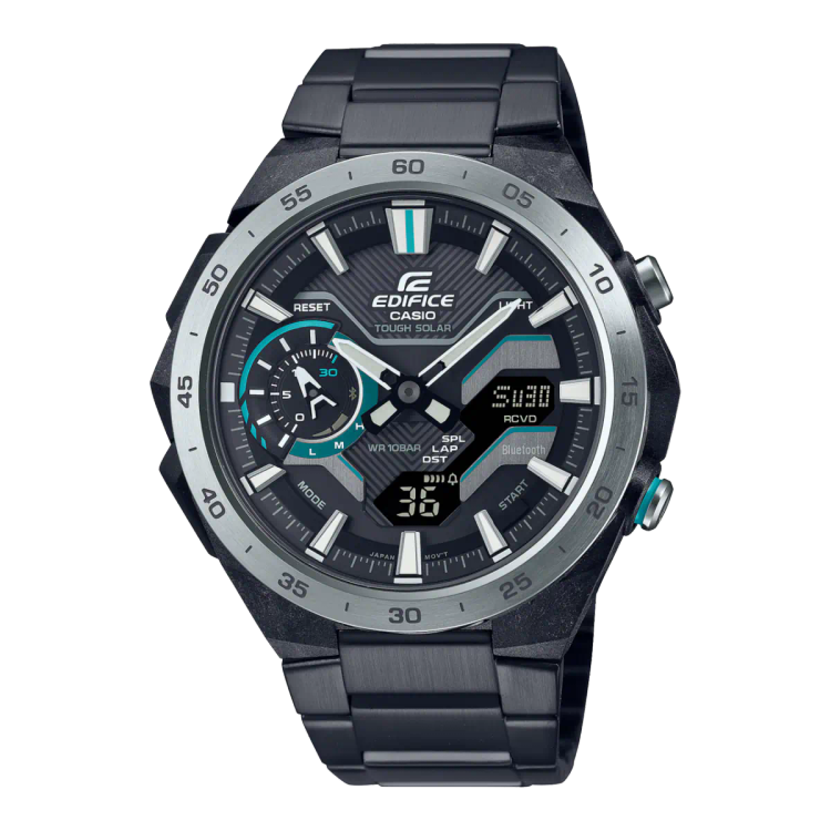 EDIFICE WINDFLOW ECB-2200DD یک کرونوگراف ترکیبی دیجیتال-آنالوگ الهامگرفته از پیست مسابقه است؛ حسی شبیه شتاب خالص یک خودروی فرمول یک که در پیست میدرخشد را منتقل میکند. طراحی نمای جانبی که با الهام از جریان باد روی یک خودروی فرمول یک با گلگیرهای پانتونی شکل گرفته، بههمراه صفحه مکانیکی تیز و چندبعدی، جلوهای ویژه از سرعت ناب ایجاد کرده است. قاب رزینی تقویتشده با فیبر کربن دوام ساعت را بالا میبرد و در عین حال وزن آن را سبک نگه میدارد تا برای استفاده روزمره مناسب باشد.