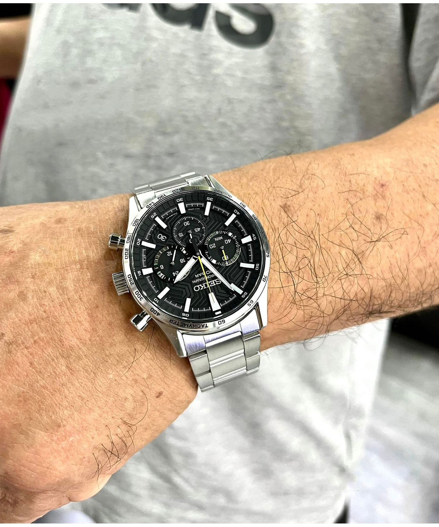 یکی از زیباترین و پرفروشترین مدلهای کرونوگراف سری SPORT برند سیکو است. این ساعت با طراحی اسپرت-مدرن، هم برای استفاده روزمره و هم برای استایل نیمهرسمی بسیار مناسب است. صفحه مشکی تمیز با سه سابدایال کرونوگراف، شاخصهای مینیمال و عقربههای لومیبریت (درخشش در تاریکی) ظاهری بسیار شیک و خوانا ایجاد کرده. قاب ۴۳ میلیمتری استیل ضدزنگ به همراه شیشه سافایر واقعی، این مدل را در برابر ضربه و خش بسیار مقاوم کرده است. مجهز به موتور کوارتز دقیق **Caliber 8T63** تهساخ ژاپن با دقت ±۱۵ ثانیه در ماه و عمر باتری حدود ۳ سال.