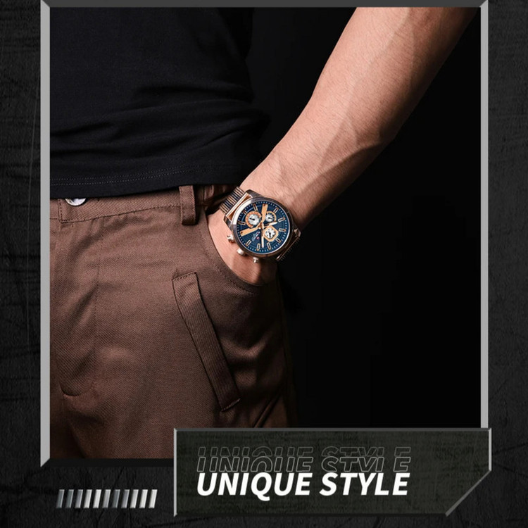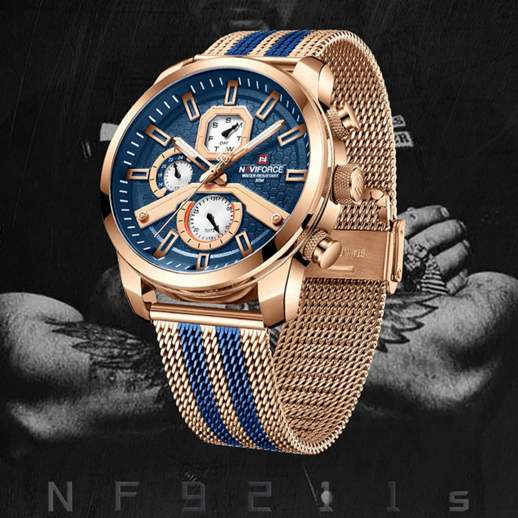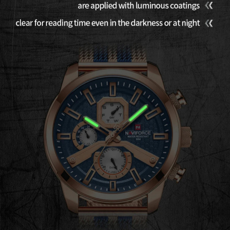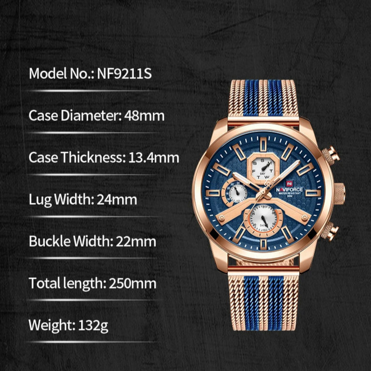 از پرطرفدارترین اکسسوریهای مردانه و زنانه، ساعتهای مچی هستند که در انواع مختلف عقربهای و دیجیتال در بازار عرضه میشوند. معمولا ساعتهای مچی دارای تقویم روزشمار نیز هستند که در دو نوع مکانیکی و کوارتز وجود دارند. ساعت مچی عقربه ای مردانه نیوی فورس مدل NF9211 جدیدترین سری نیوی فورس دارای سه موتور قدرتمند کوارتز با تقویم روزشمار و ایام هفته و همچنین نمایش 24 ساعته است است. این نوع محصول نیروی مورد نیاز خود را از طریق یک باتری تامین میکند.این ساعت دارای جنس بدنه روی Zinc ضخیم آنتی آلرژیک و بند فلزی مدل حصیری طرحدار به رنگ رزگلد و خطوط آبی رنگ است و قفل آن مدل سگکی ضامندار استیل با حک برند نیوی فورس میباشد.جنس شیشه این محصول نیز معدنی مقاوم در برابر خراش است. طراحی ضد آب: مناسب برای شستن دست، در هوای شرجی وبارانی و پاشیدن آب به ساعت و در ضمن ساعت را نمی توان در حمام گرم استفاده کرد. این ساعت عقربهای مردانه دارای ظاهری شیک و جذاب بوده و برای استفاده در هر شرایطی کاملا مناسب خواهد بود.برند نیوی فورس بر روی صفحه،سرکوک،قفل و پشت درب ساعت به زیبایی حک شده است.ارسال کالا بهمراه دفترچه،کارت و جعبه هاردباکس بالشتک دار نیوی فورس و همچنین یک عدد باتری اضافه.