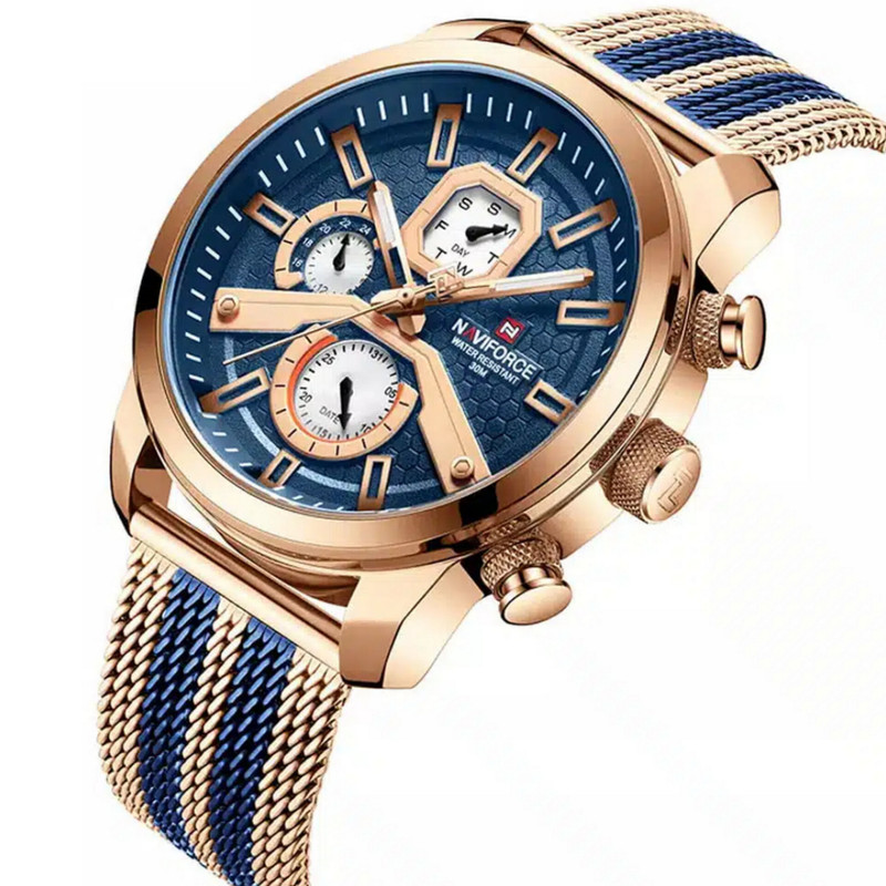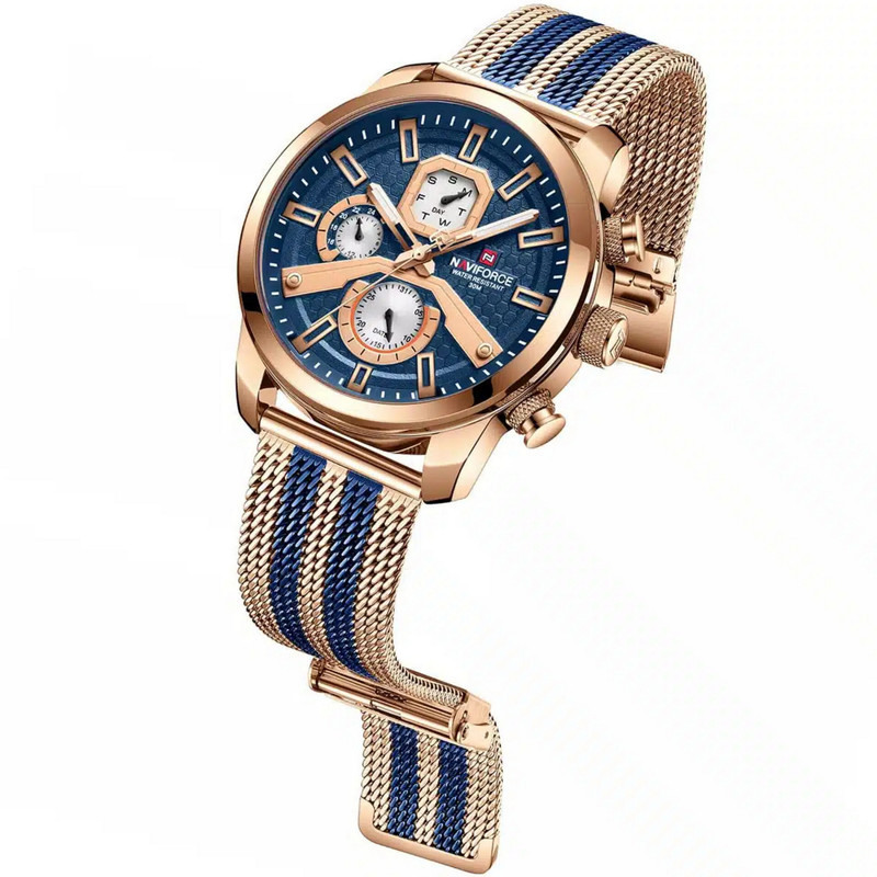 از پرطرفدارترین اکسسوریهای مردانه و زنانه، ساعتهای مچی هستند که در انواع مختلف عقربهای و دیجیتال در بازار عرضه میشوند. معمولا ساعتهای مچی دارای تقویم روزشمار نیز هستند که در دو نوع مکانیکی و کوارتز وجود دارند. ساعت مچی عقربه ای مردانه نیوی فورس مدل NF9211 جدیدترین سری نیوی فورس دارای سه موتور قدرتمند کوارتز با تقویم روزشمار و ایام هفته و همچنین نمایش 24 ساعته است است. این نوع محصول نیروی مورد نیاز خود را از طریق یک باتری تامین میکند.این ساعت دارای جنس بدنه روی Zinc ضخیم آنتی آلرژیک و بند فلزی مدل حصیری طرحدار به رنگ رزگلد و خطوط آبی رنگ است و قفل آن مدل سگکی ضامندار استیل با حک برند نیوی فورس میباشد.جنس شیشه این محصول نیز معدنی مقاوم در برابر خراش است. طراحی ضد آب: مناسب برای شستن دست، در هوای شرجی وبارانی و پاشیدن آب به ساعت و در ضمن ساعت را نمی توان در حمام گرم استفاده کرد. این ساعت عقربهای مردانه دارای ظاهری شیک و جذاب بوده و برای استفاده در هر شرایطی کاملا مناسب خواهد بود.برند نیوی فورس بر روی صفحه،سرکوک،قفل و پشت درب ساعت به زیبایی حک شده است.ارسال کالا بهمراه دفترچه،کارت و جعبه هاردباکس بالشتک دار نیوی فورس و همچنین یک عدد باتری اضافه.