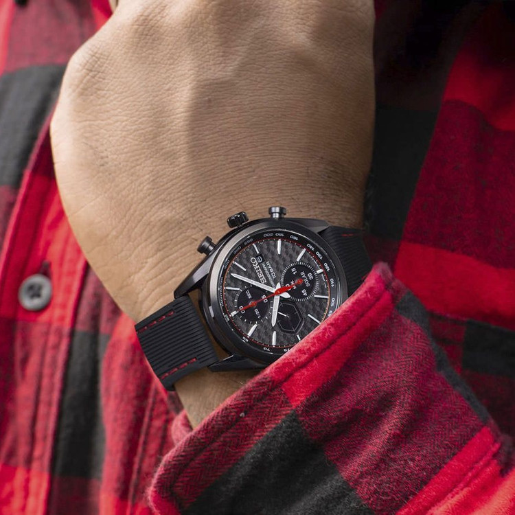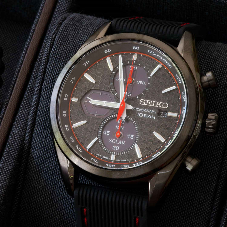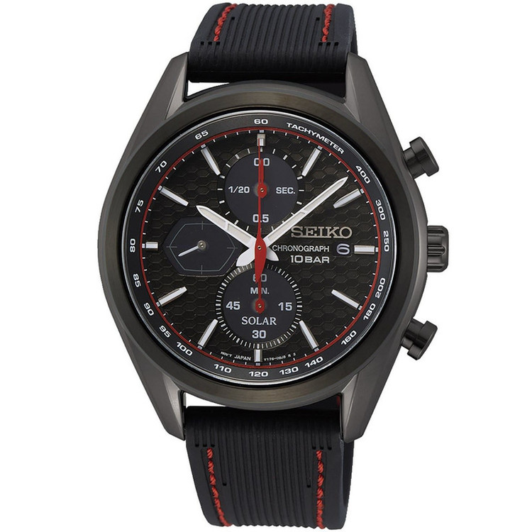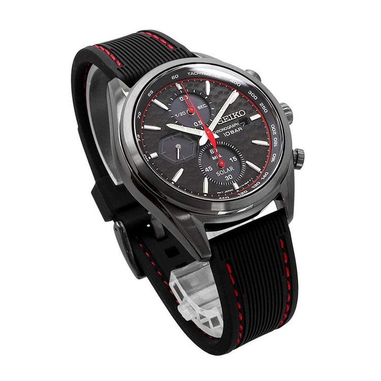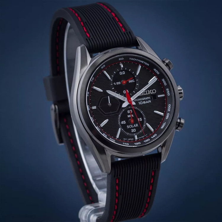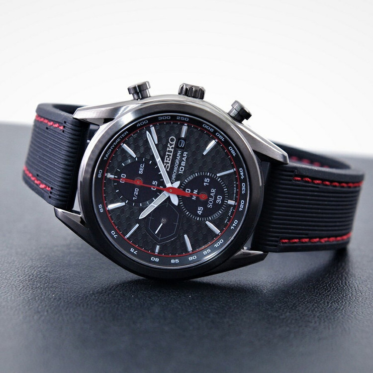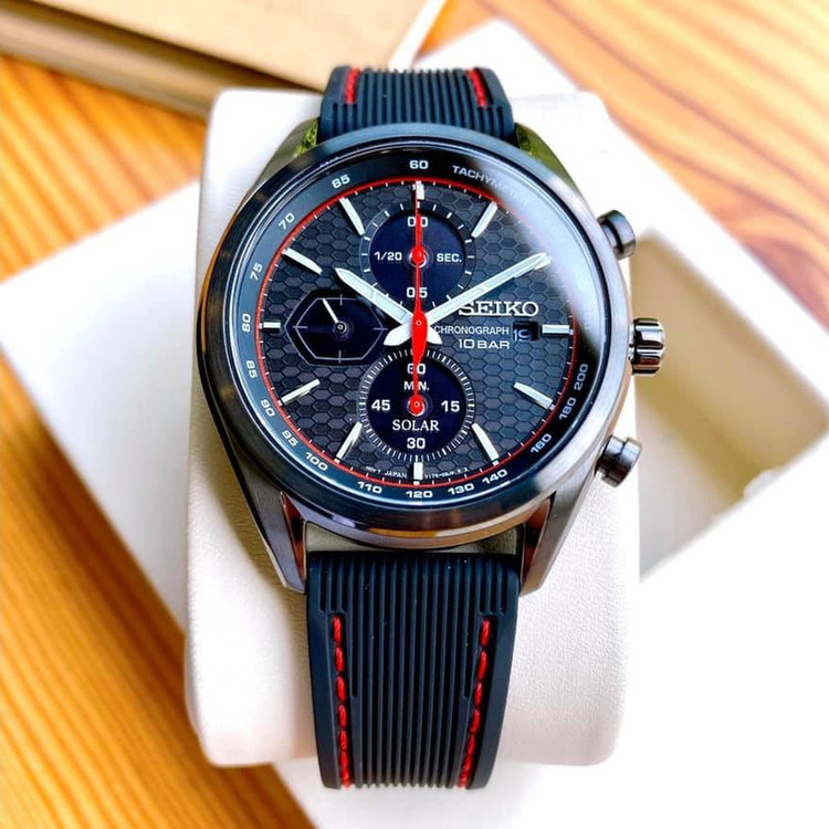 این طرح از برند ساعت سیکو با طراحی و رنگ خاص خود برای تیپهای مجلسی بسیار مناسب میباشد.بند این ساعت سیکو از جنس رابر و بدنه ی آن استیل است که از ترکیب رنگ های مشکی و قرمز در آن استفاده شده. از ویژگیهای منحصر به فرد این ساعت میتوان به طراحی بسیار شیک و مجلسی ساعت اشاره کرد. سیستم کارکرد ساعت در این طرح از برند سیکو سولار میباشد که از تکنولوژیهای به روز و جدید سیکو است. در این تکنولوژی نوری که به صفحه ی ساعت میتابد به صورت انرژی الکتریکی در باطری ساعت ذخیره میشود و نیازی به تعویض باطری ندارد. از دیگر ویژگی های منحصر بفرد این ساعت میتوان به نمایشگر روزهای ماه و سرعت سنج و کرنومتر با دقت با دقت 1.20 ثانیه اشاره کرد.