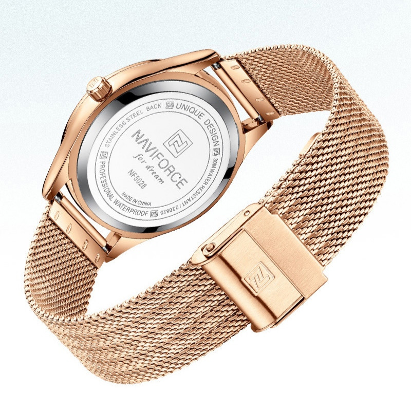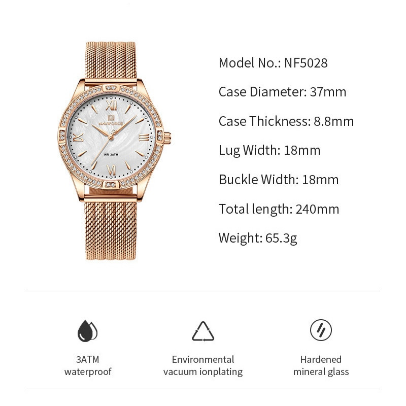 نیوی فورسNF5028Naviforceیکی از جدیدترین مدل کمپانی ناوی فورس است که در یک ماه اخیر تولید و روانه بازار جهانی شده است . این مدل مثل بقیه تولیدات این شرکت بزرگ و معروف از کیفیت بسیار بالای برخوردار بوده و از یک موتور ژاپن درجه یک ساخته شده و همچنین دارای قاب فول استیل تو پر و سنگین بوده و تا عمق 3 متری ضدآب است که میتوانید این ساعت زنانه اوریجینال را همیشه در دستان زیبای خود داشته باشید . کالا اصلی و شرکتی می باشد و موتور آن کوارتز ساخت ژاپن با کیفیت درجه یک است بند و بدنه فول استیل رنگ ثابت و ضد حساسیت است وشیشه ساعت کریستالی مقاوم در برابرخط وخش و ضد آب تا 3 متر است