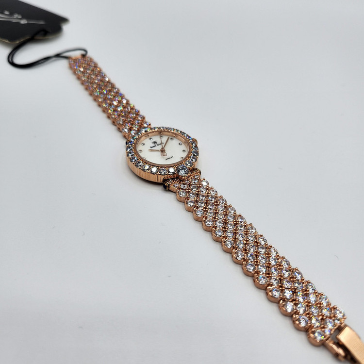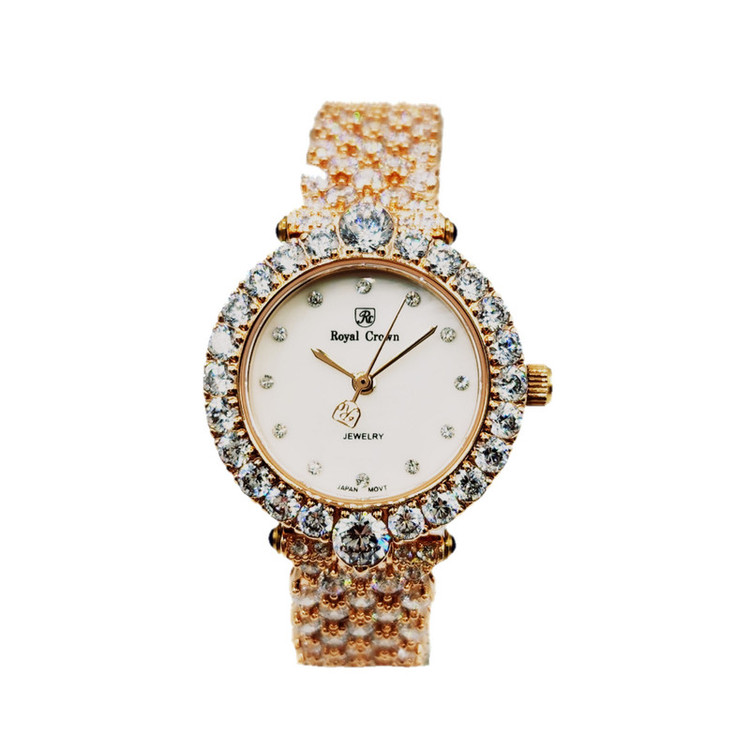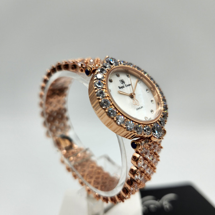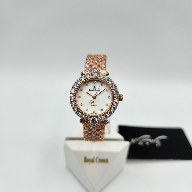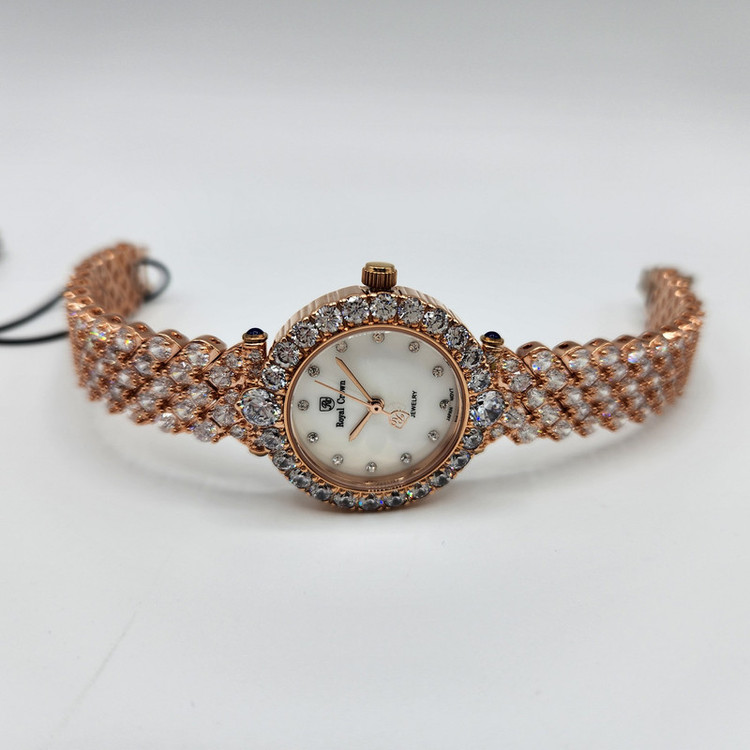 برند انگلیسی رویال کرون تخصص در تولید ساعت های فول نگین زنانه با نگین های سواروسکی دارد که از کیفیت فوق العاده بالایی بهره میبرد. موتور این ساعت های خاص ژاپنی میباشد و قاومت در برابر آب نیز دارند. ساعت های بسیار خاص و مجلسی که جلوه و درخشش خیلی زیادی دارند و نظر هر بیننده ای را جلب میکند.