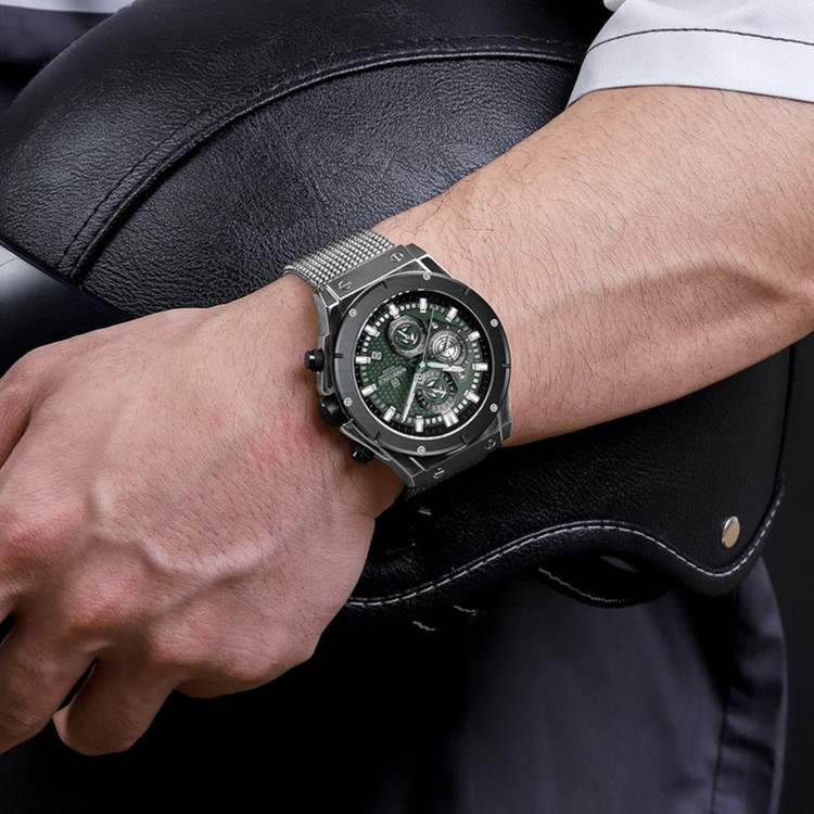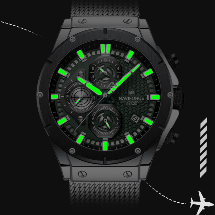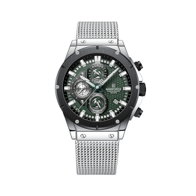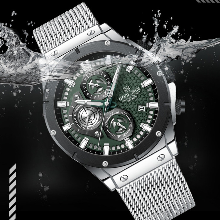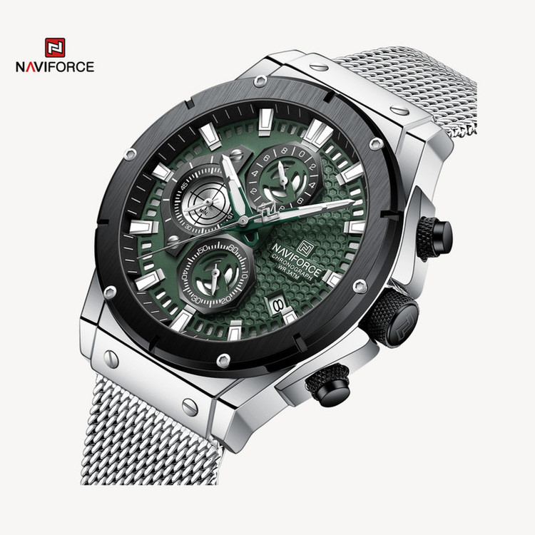 از پرطرفدارترین اکسسوریهای مردانه و زنانه، ساعتهای مچی هستند که در انواع مختلف عقربهای و دیجیتال در بازار عرضه میشوند. معمولا ساعتهای مچی دارای تقویم روزشمار نیز هستند که در دو نوع مکانیکی و کوارتز وجود دارند. ساعت مچی عقربه ای مردانه نیوی فورس مدل NF8027-S/GN دارای موتور کوارتز کرنوگراف و تقویم روزشمار است، این نوع محصول نیروی مورد نیاز خود را از طریق یک باتری تامین میکنند. این مدل ساعتها در اندازهگیری زمان بسیار دقیق و قابل اعتماد بوده و درصد خطای آنها کمتر از انواع دیگر است.این ساعت دارای جنس بدنه استیل نقره ای رنگ و فریم مشکی با بند مدل حصیری بوده و قابل استفاده برای آقایان است. جنس شیشه این محصول نیز معدنی است همچنین عقربه ها و اعداد شب تاب هستند و ساعت در برابر پاشش آب مقاوم است. این ساعت عقربهای مردانه دارای ظاهری شیک و جذاب بوده و برای استفاده در شرایط رسمی و نیمهرسمی کاملا مناسب خواهد بود.