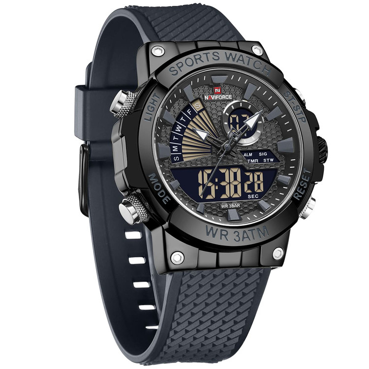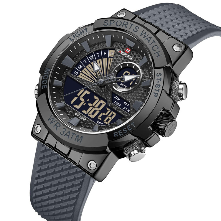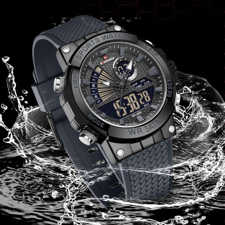 ساعت مچی عقربه ای مردانه نیوی فورس مدل nf9219 دیجیتال _آنالوگ دارای موتور قدرتمند کوارتز است این نوع محصول نیروی مورد نیاز خود را از طریق یک باتری تامین میکند.این ساعت دارای جنس بدنه استیل ضخیم است و شیشه این ساعت معدنی تقویت شده و مقاوم در برابر خراش است.قفل ساعت مدل کلیپسی ضامن دار است..حک برند NAVIFORCE بر روی صفحه،قفل،سرکوک و درب ساعت. این ساعت عقربهای مردانه دارای ظاهری شیک و جذاب بوده و برای استفاده در هر شرایطی کاملا مناسب خواهد بود.