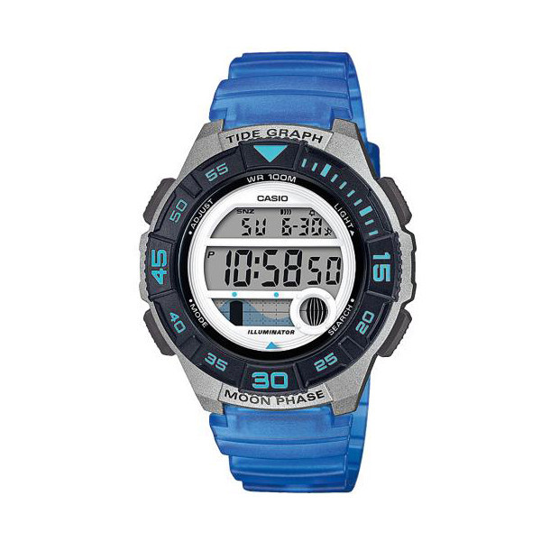 مقاومت در برابر آب تا عمق 100 متری نمودار جزر و مد اطلاعات کره ماه (با نشانگر وضعیت ماه) باتری با عمر 5 ساله چراغ LED دو زمانه کرونومتر 1/100 ثانیهای بند شفاف 3 آلارم